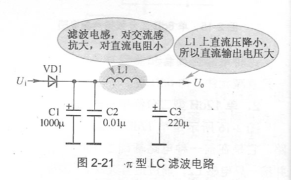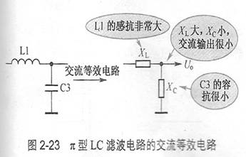图2—21所示是π型Lc滤波电路。电路中的cl和c3是滤波电容,c2是高频滤波电容,L1是滤波电感,L1代替π型Rc滤波电路中的滤波电阻。电容c1是主滤波电容,将整流电路输出电压中的绝大部分交流成分滤波到地。