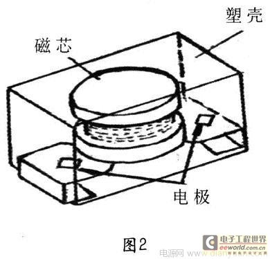 另一种形式的片式电感器是片式绕线电感器,这是对传统绕线型电感器的一种改进,采用微小型工字型磁芯,经绕线、焊接、电极成型、塑封等工序制成,见图2。这种类型的片式电感生产工艺简单,电性能优良(电感量大,品质因素高),适合于大电流通过,可靠性好。但受磁芯尺寸和制造工艺限制,进一步微小型有困难。